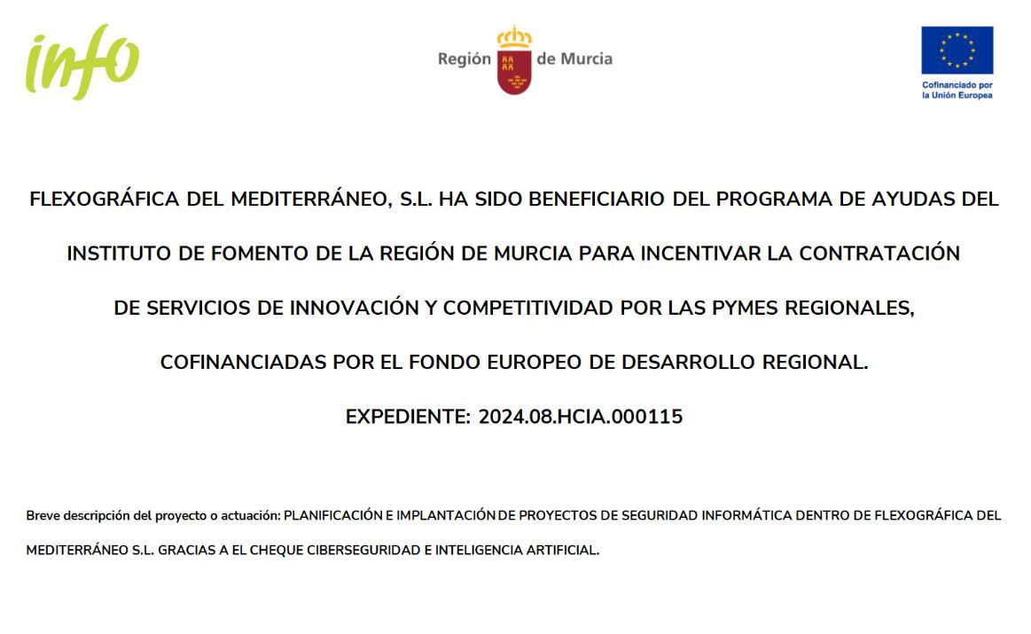 📦Flexomed ha recibido una ayuda del Instituto de Fomento de la Región de Murcia (INFO) para la contratación de servicios de ciberseguridad, a través del Programa para incentivar la contratación de servicios de innovación y competitividad – Cheque Ciberseguridad, cofinanciado por el Fondo Europeo de Desarrollo Regional (FEDER) dentro del Programa Operativo FEDER de la Región de Murcia 2021-2027.