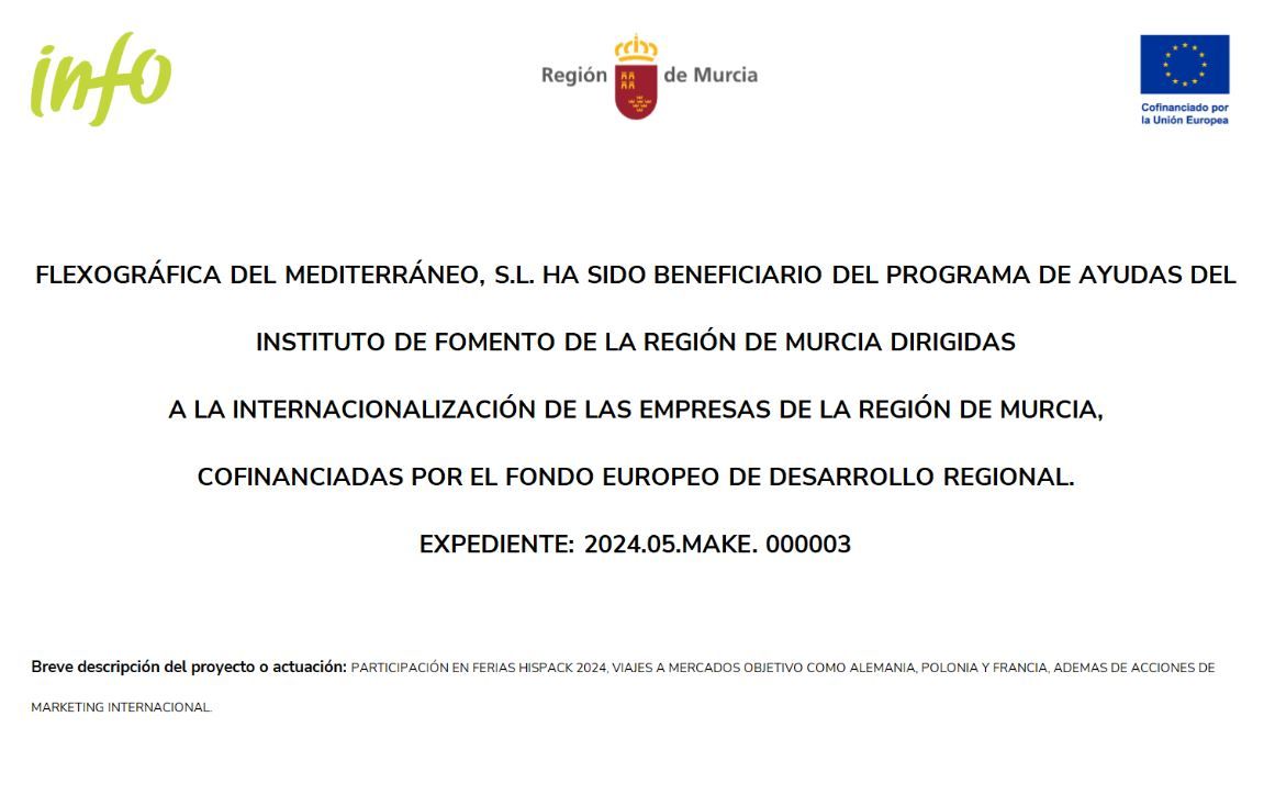 En 📦 FLEXOMED hemos sido beneficiaria del Programa de Ayudas del Instituto de Fomento de la Región de Murcia (INFO) dirigidas a la internacionalización de las empresas de la Región de Murcia, cofinanciadas por el Fondo Europeo de Desarrollo Regional (FEDER). “Una manera de hacer Europa”.